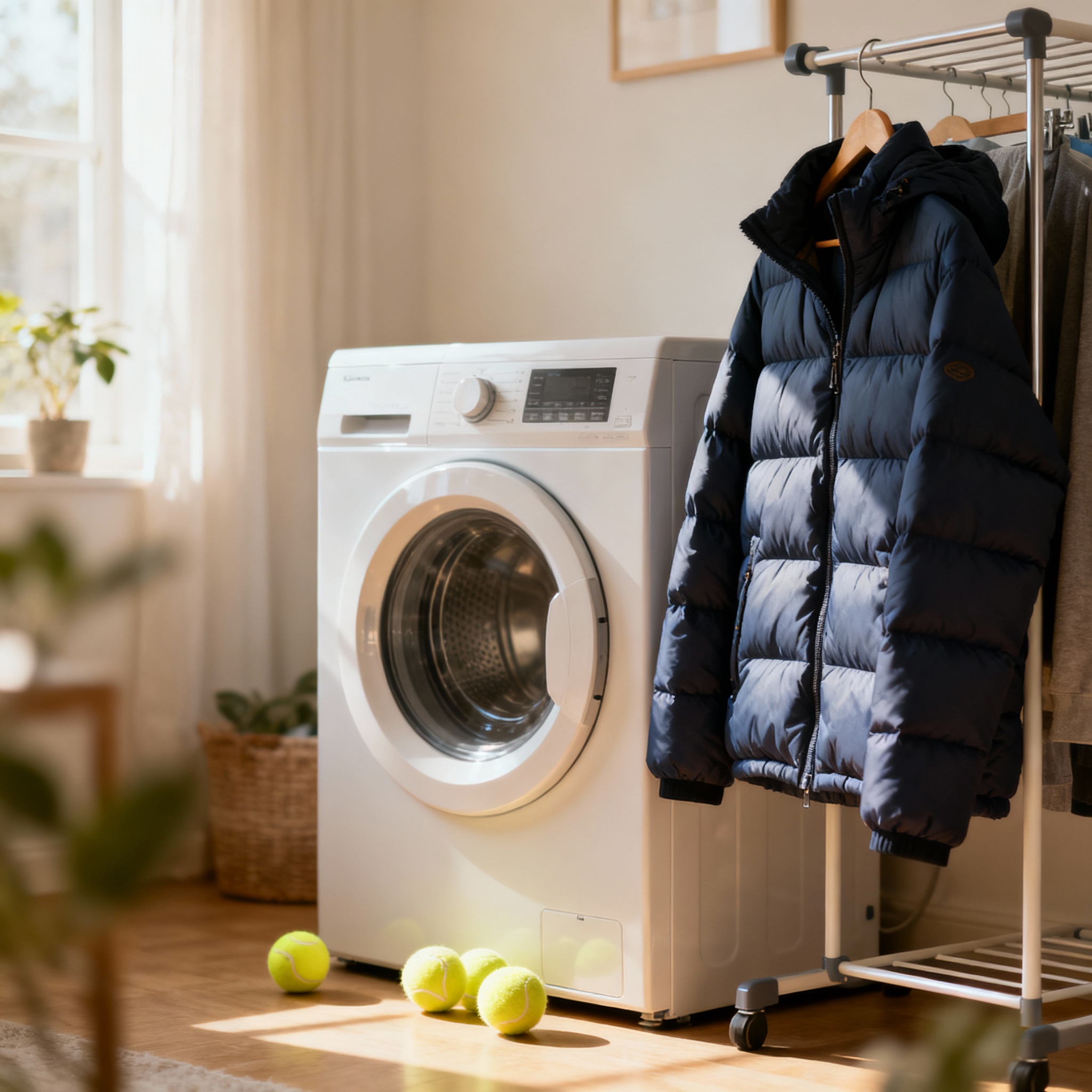 Для того чтобы пух не сбивался в комки, можно использовать теннисные мячики, которые кладутся в сушильную машину вместе с курткой. Мячики помогут пуху расправиться и не сбиться в комки, создавая воздушную прослойку внутри.