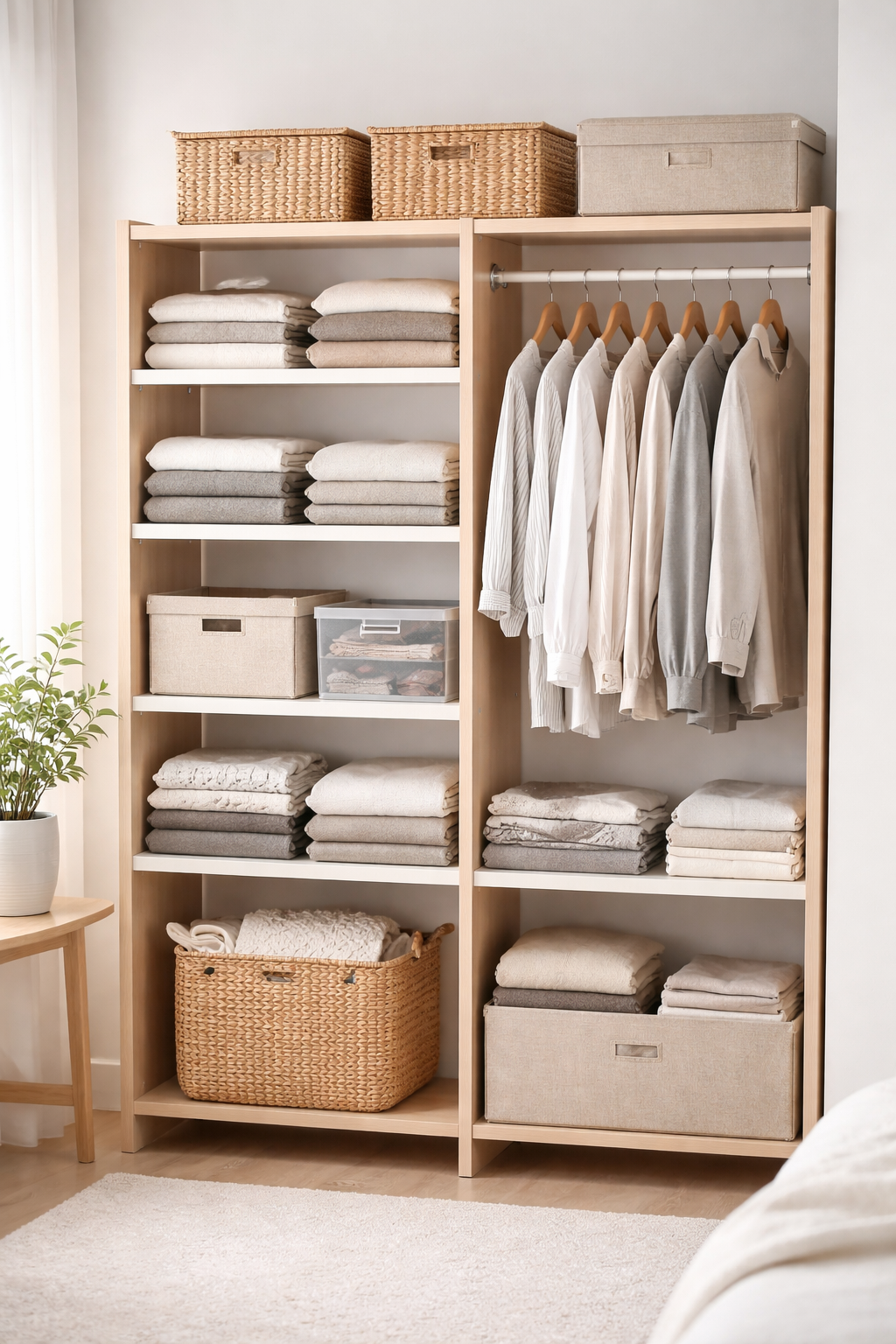 Грамотный менеджмент предполагает деление шкафа на зоны: верхняя часть — для редко используемых или сезонных вещей, средняя — для повседневной одежды, нижняя — для обуви или коробок. Использование коробок, контейнеров и разделителей помогает структурировать пространство.