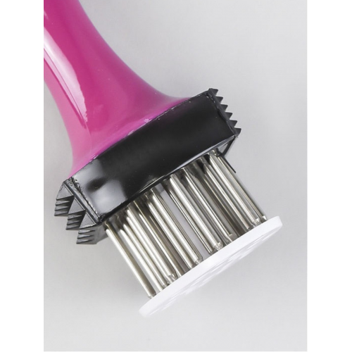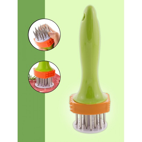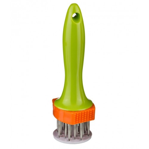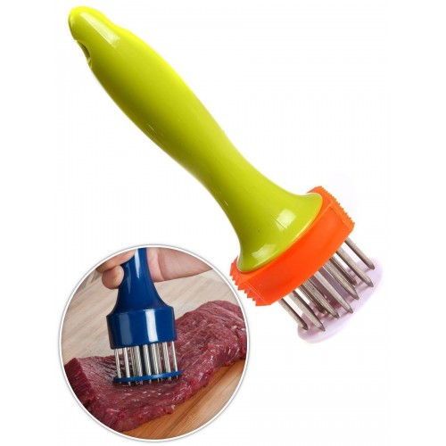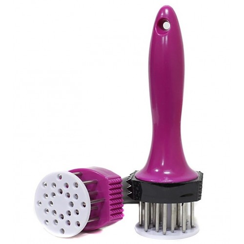 Тендерайзер – современный молоток для отбивания мяса, который поможет улучшить и ускорить процесс приготовления блюд из разных видов мяса и рыбы. От ударов о поверхность производится выдвижение лезвий, которые создают насечки по всей толщине куска, что делает мясо более нежным и вкусным. Тендерайзер отбивает продукты без приложения усилий, мясной сок при этом не разбрызгивается. Можно предварительно смочить куски маринадом – это обеспечит его более глубокое проникновение в мышечные волокна. Отбивные станут более диетическими и полезными, если их пожарить на сухом противне или сковороде. При этом мясо не будет съеживаться, как после отбивания традиционным молотком.